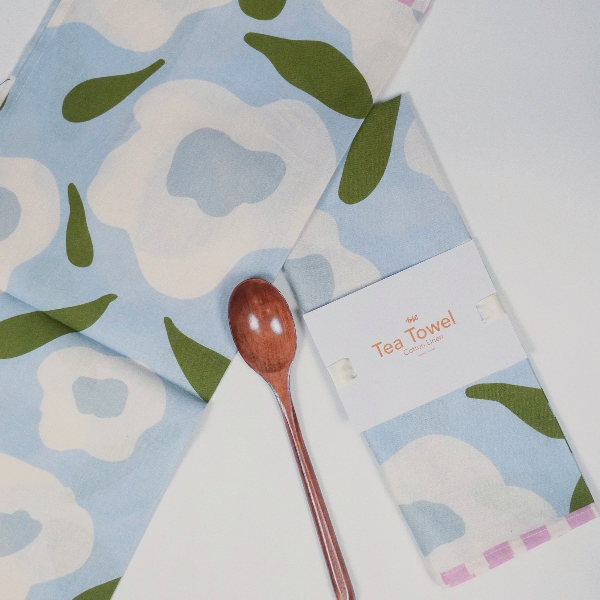Our tea towels are thoughtfully crafted with care - it features Oris Eddu's artwork from our latest collection, to bring a sense of calm to your kitchen. This set of two includes folded hems and a white hang tab on the back for easy hanging—perfect for adding a touch of art to your everyday routine.