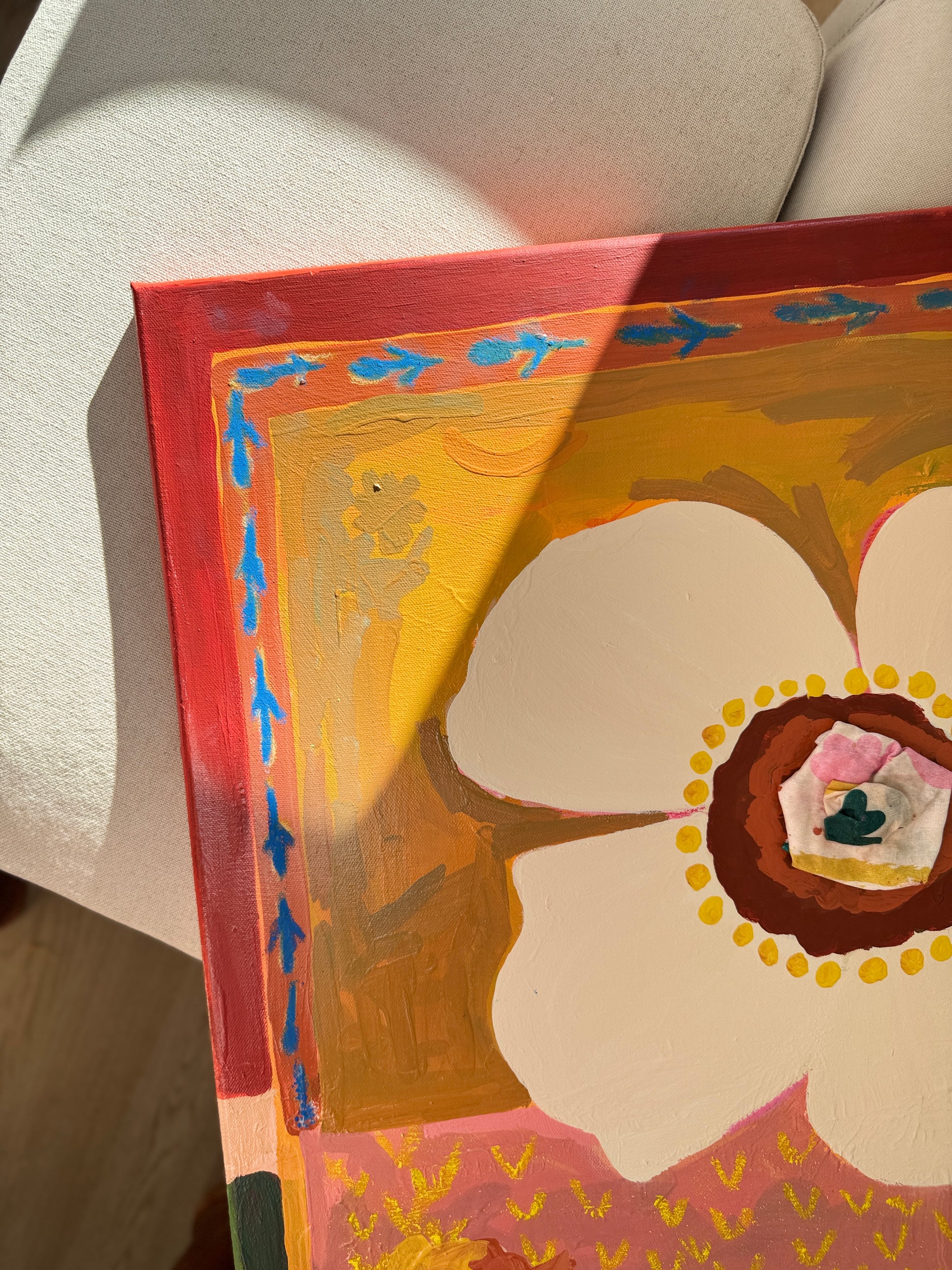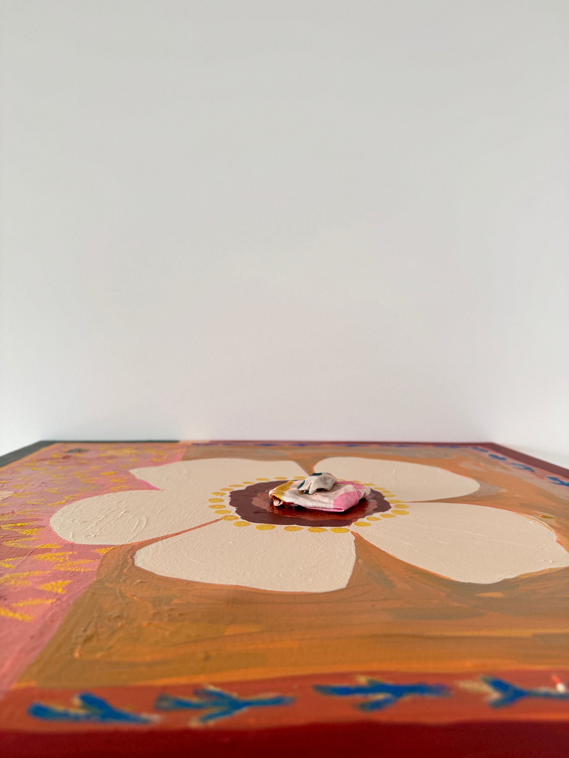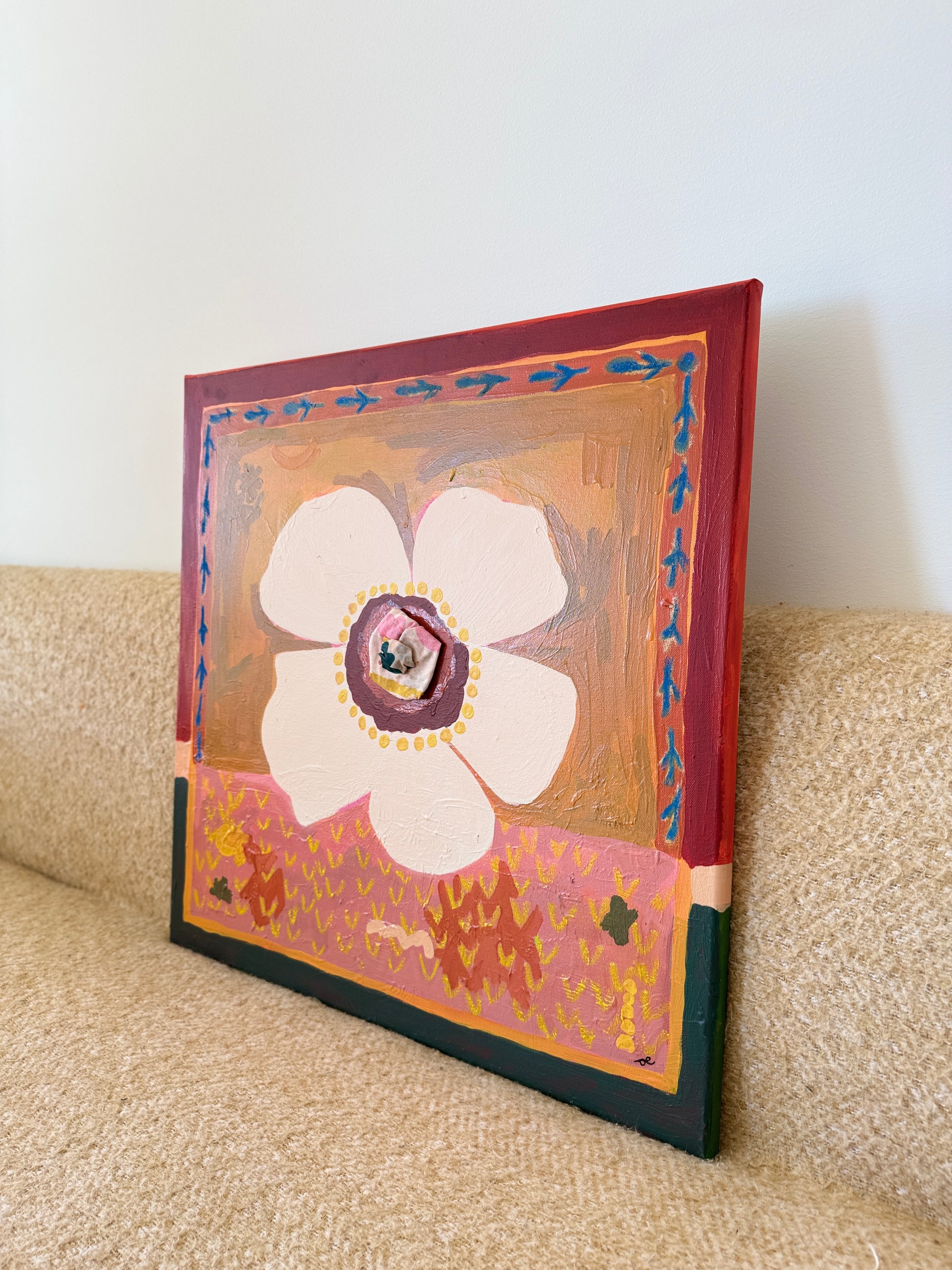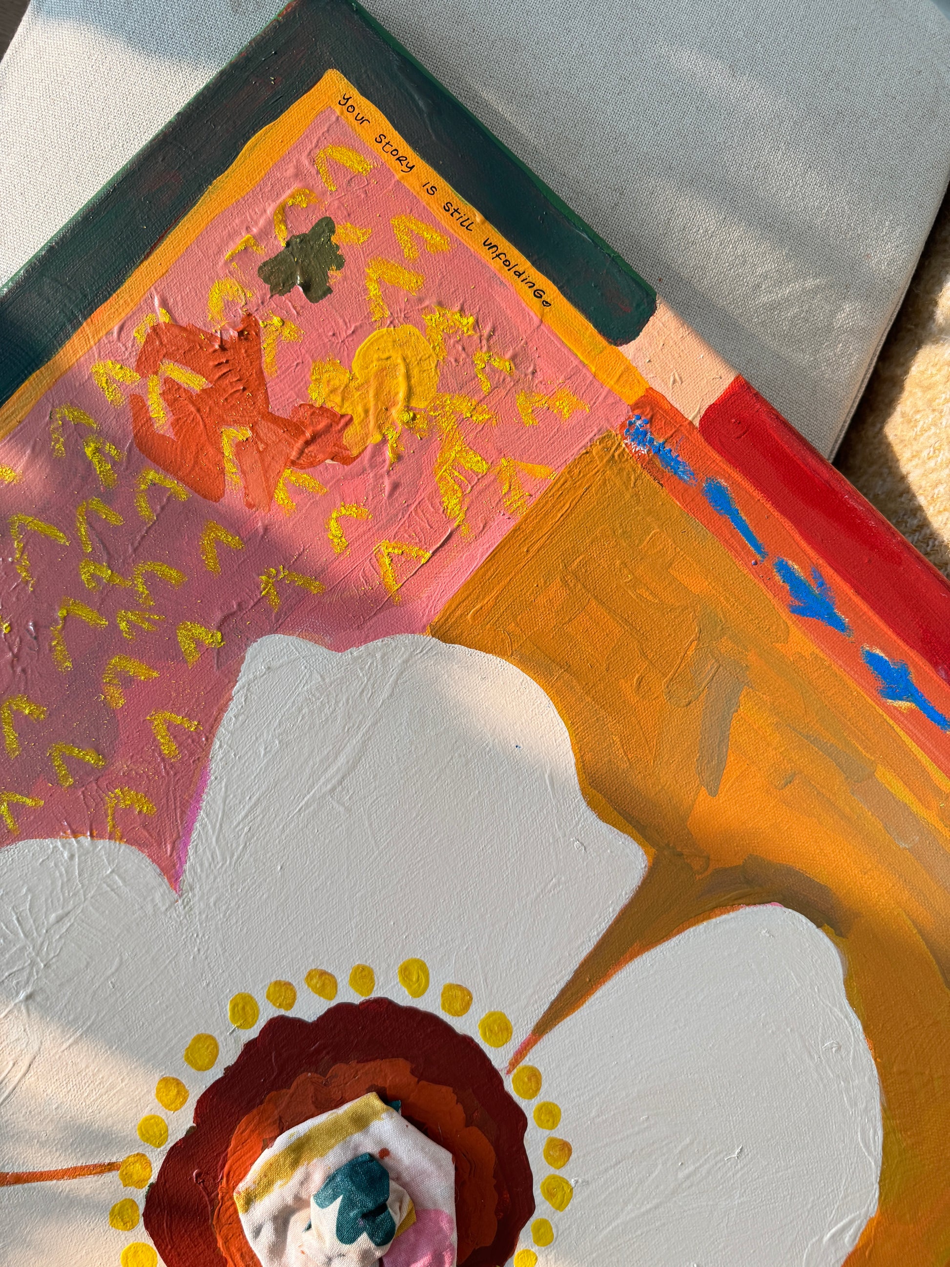 Like a chapter still being written, this piece holds space for the beauty of becoming. Layered with paint, pastels, and fabric, it’s a reminder that your story is still unfolding; and that there’s magic in the in-between.